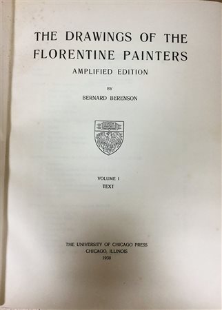 BERENSON, Bernard. The Drawings of the Florentine Painters. Chicago, 1938. 3 volumi in folio, con il terzo volumo di illustrazioni in bianco e nero (lievissime fioriture). Importante edizione originale. Legatura in mezza pergamena e piatti marmorizzati (lievi difetti).
