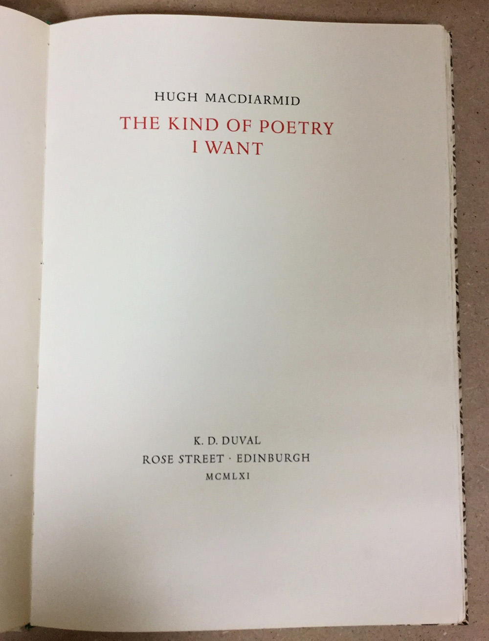MACDIARMID, Hugh. The kind of poetry I want. Edimburgo: K. D. Duval, 1961....