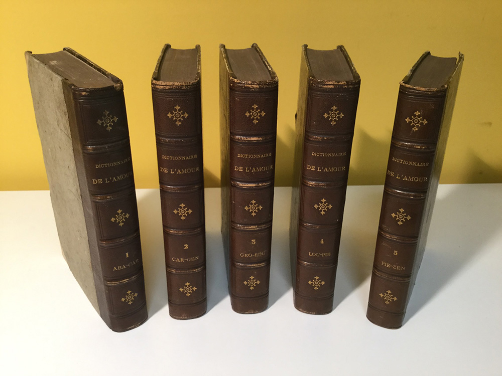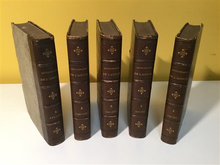[MOUCHET]. Dictionnaire contenant les anecdotes historiques de l'amour. Troyes: Gobelet, 1811. 5 volumi in 8vo (lievi gore di umidità al volume 1). Legature in mezza pelle con il titolo dell'opera impressa in oro sul dorso.