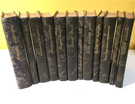 SCARLATTI, Americo. Et ab hic et ab hoc. Torino: Unione tipografico-editrice torinese, 1923-42. Collana costituita da 12 volumi in 8vo. Nomi, cognomi e soprannomi; Iscrizioni di edifici; Malattie del linguaggio; Il castello dei sogni... Legatura coeva in piena pelle di colore verde, (il primo volume con legatura cartonata in colore grigio ad imitare la legatura originale).