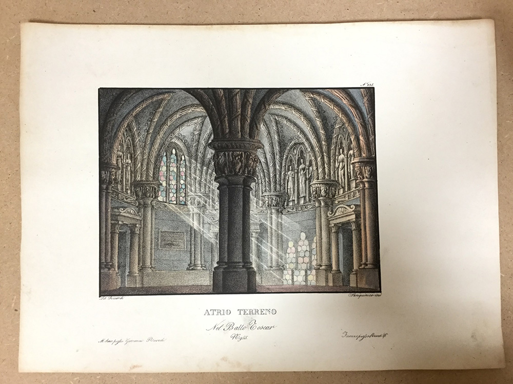 Raccolta di varie decorazioni sceniche inventate ed eseguite per il teatro La Scala. 1832 circa. 33 acquatinte colorate a mano raffiguranti prevalentemente paesaggi, interni di palazzi e monumenti.