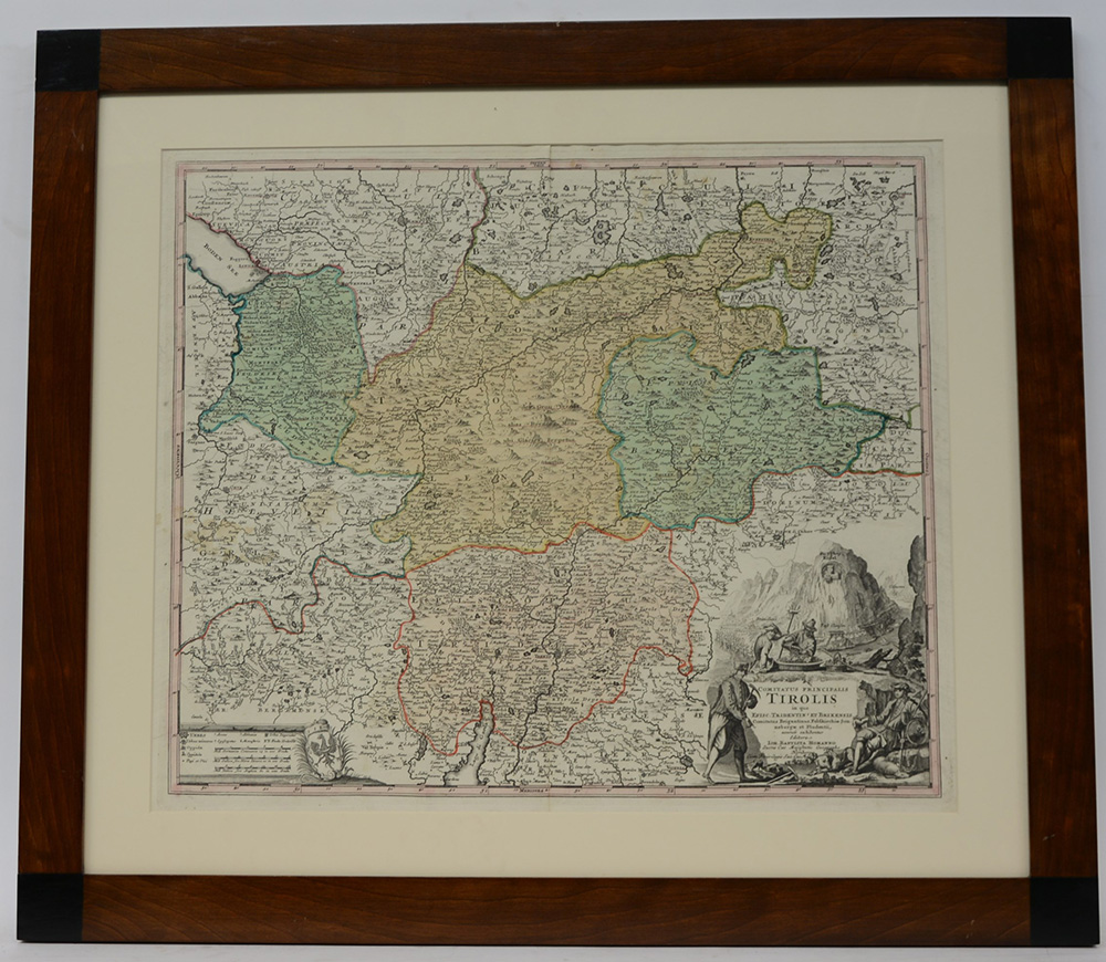 Giovan Battista Homann "Tirolo" incisione in rame del XVIII secolo (battitura 495 x 570mm) colorata a mano. In cornice.