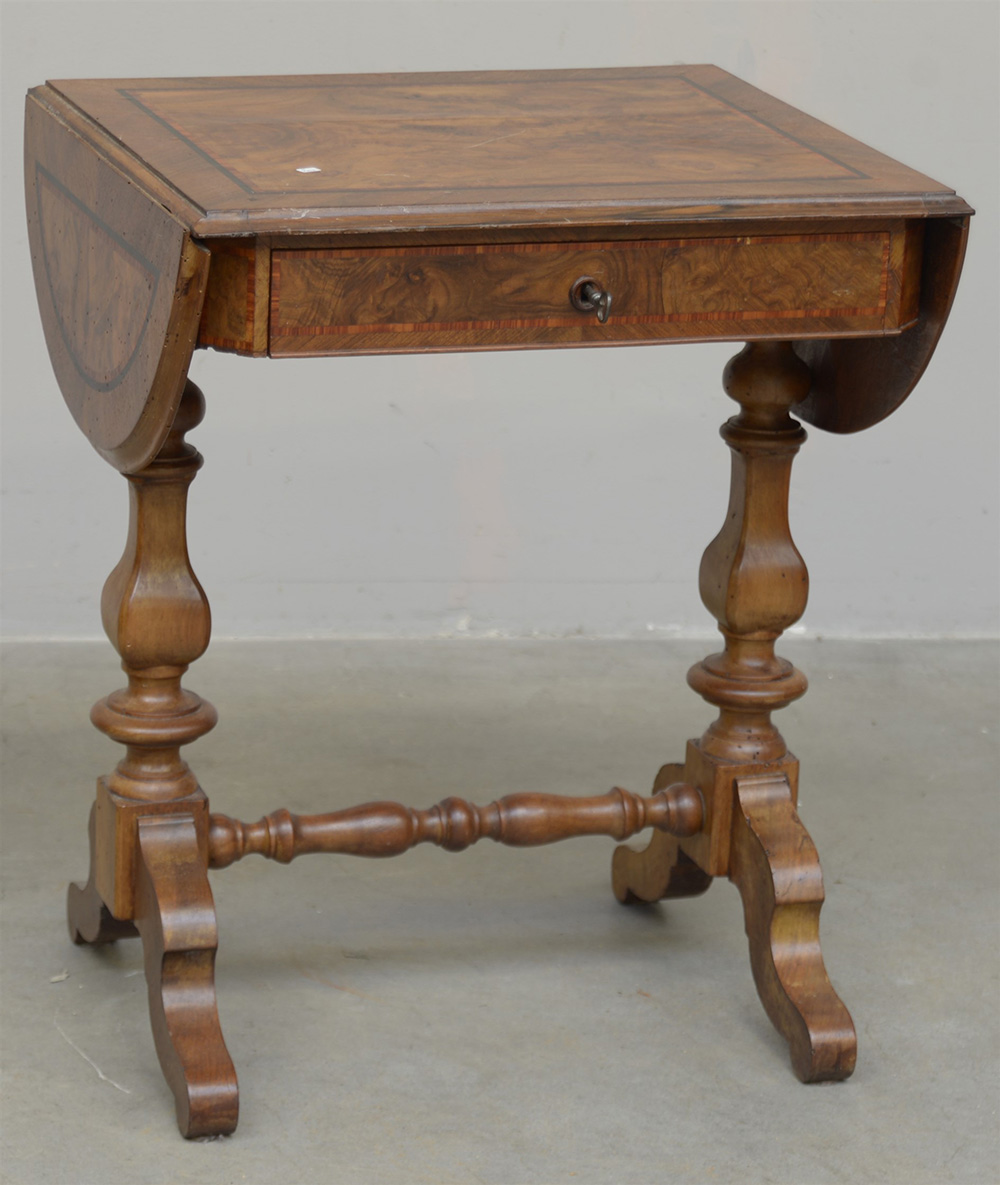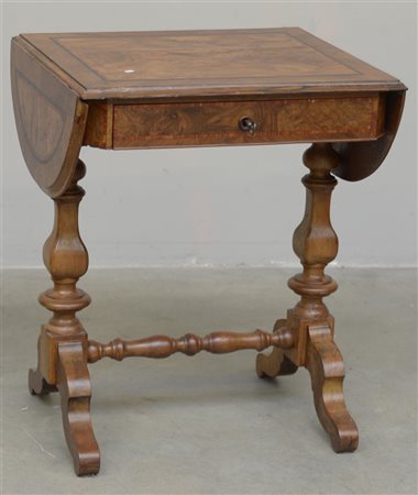 Tavolino con piano ad alette ed un cassetto nella fascia, lastronato e...