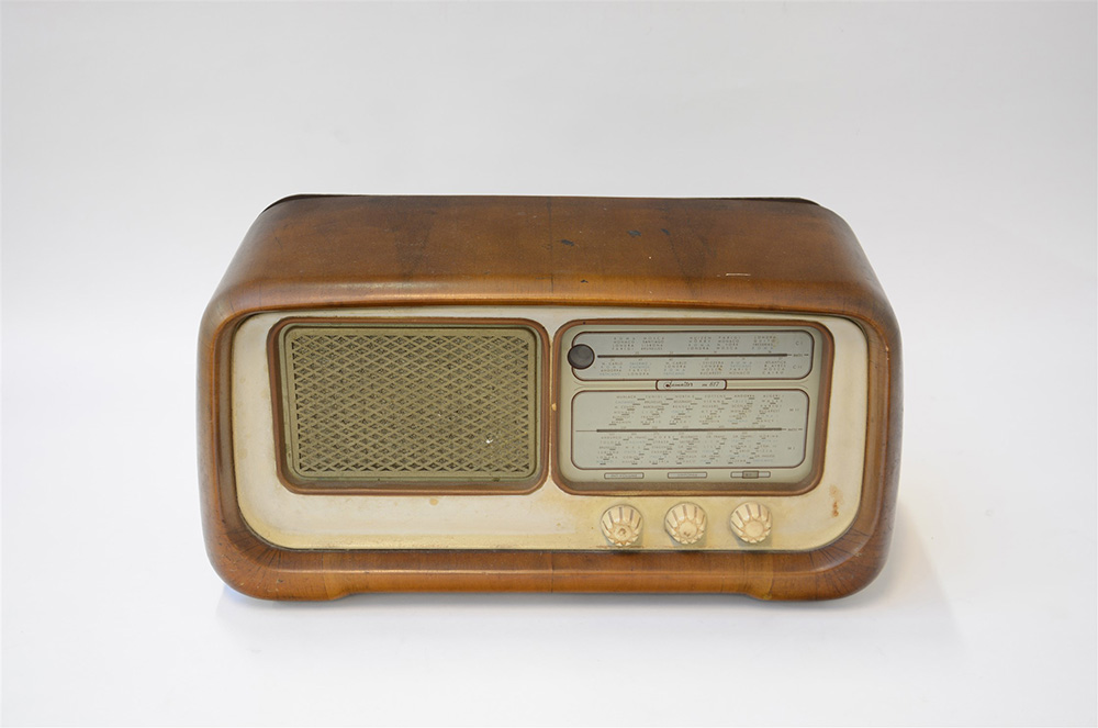 Radio Damaiter modello "m 817" in legno, anni '50 (cm 27x51) (difetti)