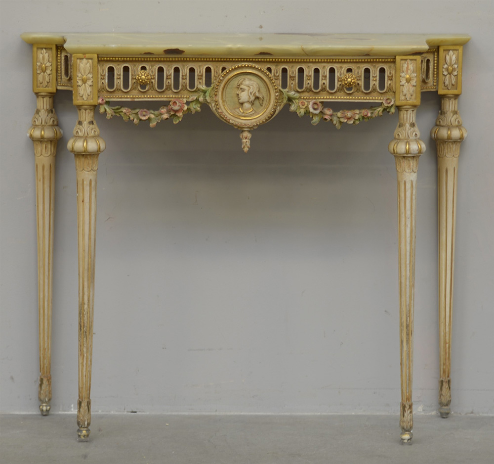 Consolina in legno laccato, dorato e intagliato con medaglione e motivi floreali, gambe scanalate, piano in onice (cm 100x88x32)(difetti)