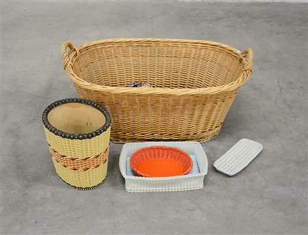 Lotto composto da cinque cestini in vimini e plastica, colori e misure...