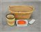 Lotto composto da cinque cestini in vimini e plastica, colori e misure diverse (difetti)