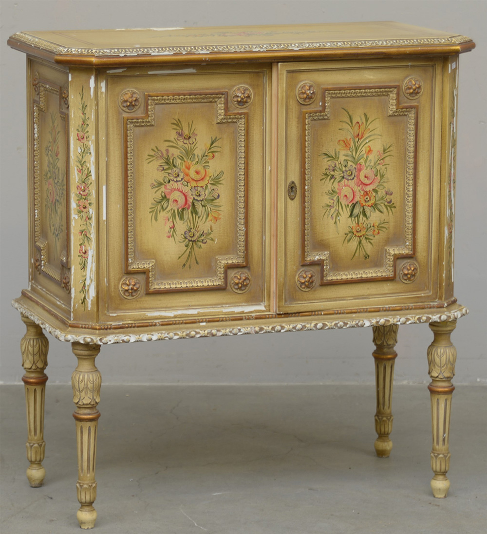 Mobiletto a due ante in legno laccato e decorato a fiori in policromia (cm 80x86x38)(difetti)