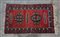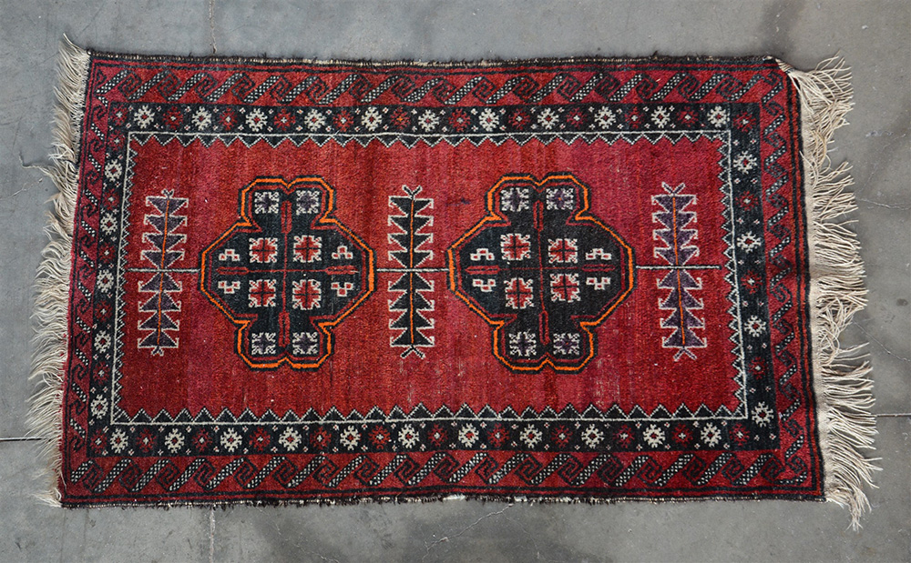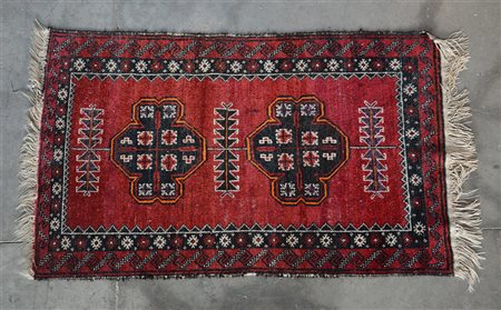 [Tappeti] Afghan, Turkestan occidentale, secolo XX. Disegno a due medaglioni a fiore nei toni del nero, bianco, lilla e rosso su fondo rosso. (cm 138x88) (difetti)