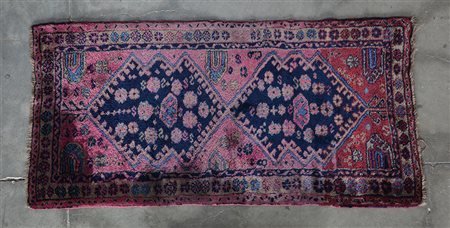 [Tappeti] Ushak, Anatolia, secolo XX. Disegno a due medaglioni blu su fondo uva. (cm 140x71) (difetti)