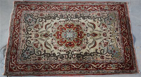 [Tappeti] Tappeto Isphahan, Persia, sec. XX. Disegno a medaglioni con animali stilizzati policromi su fondo bianco(cm 205x135) (difetti)