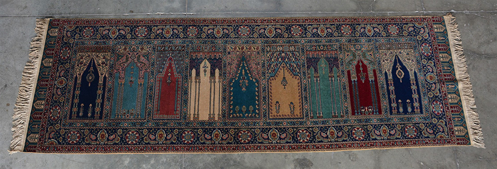 [Tappeti] Tappeto Kaisery, Anatolia, secolo XX. Disegno a preghiera "Saph". Nove Mirab policromi con diverse fogge. Bordura Herati su fondo blu (cm 295x103) (difetti)