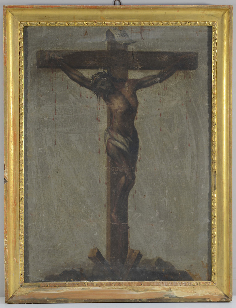 Scuola del secolo XVIII "Cristo crocifisso" olio su tela (cm 61x46) in cornice(difetti e restauri)