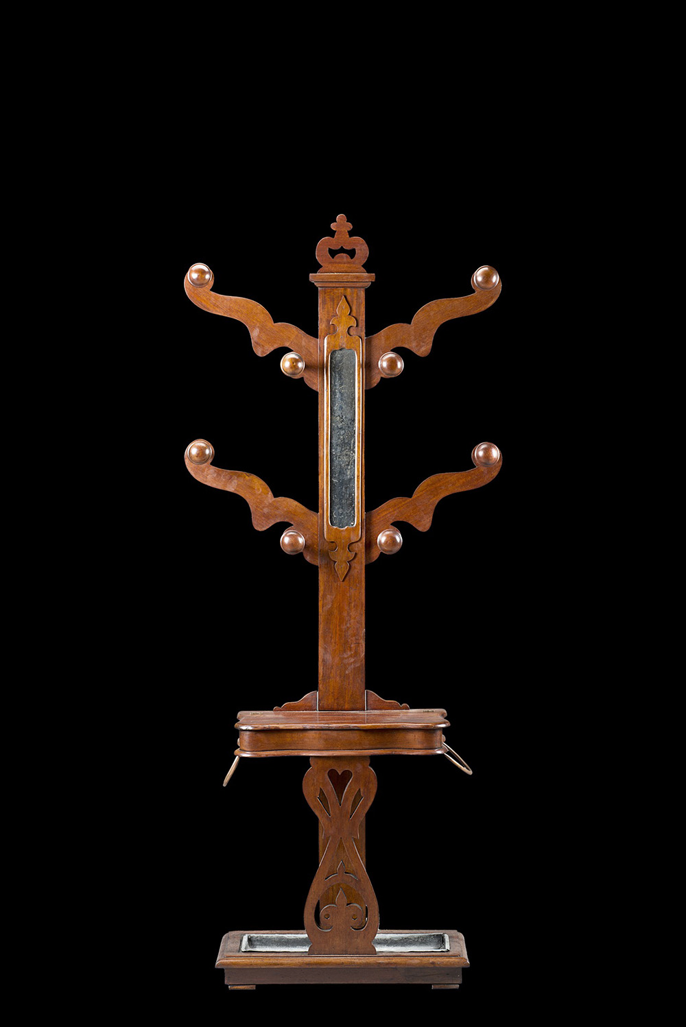 Appendiabiti a sei grucce su braccia sagomate con piccolo specchio centrale, vano porta spazzole e gancio porta ombrelli con gocciolatoio. Fine sec. XIX (cm 84x200x26) (difetti) -EN A six-hanger hall stand. Late 19th century (cm 84x200x26) (defects)