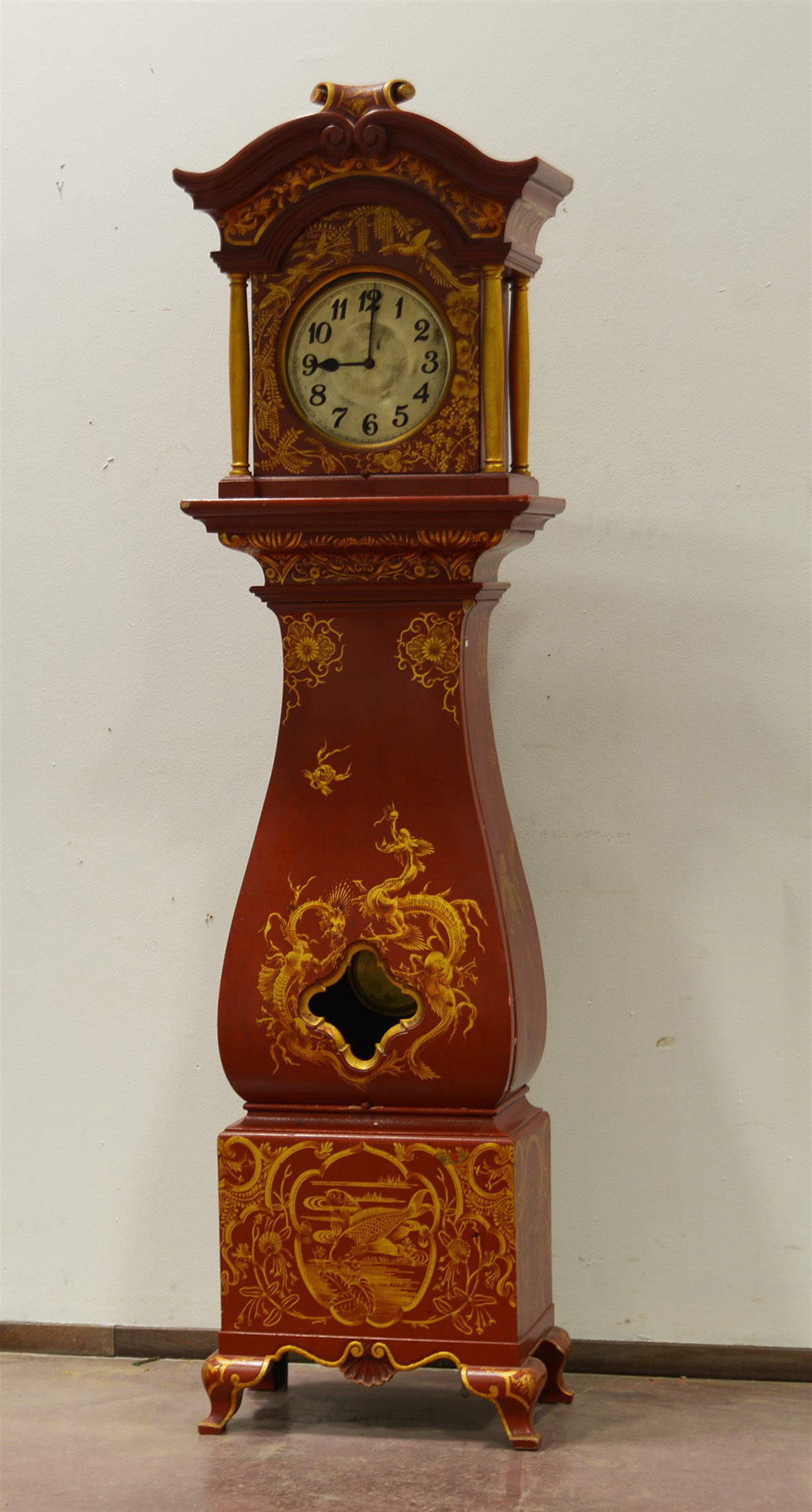 Pendola a torre di forma sagomata in legno laccato a fondo rosso decorata a cineserie in oro, quadrante a numeri arabi (h cm 220)(difetti)