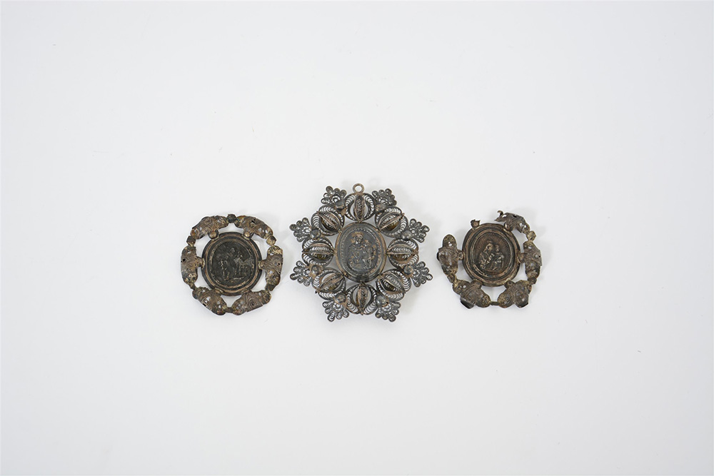 Lotto di tre placchette devozionali in argento e filigrana d'argento (max cm 7 ca.) (gr 20 ca.) (difetti e mancanze)