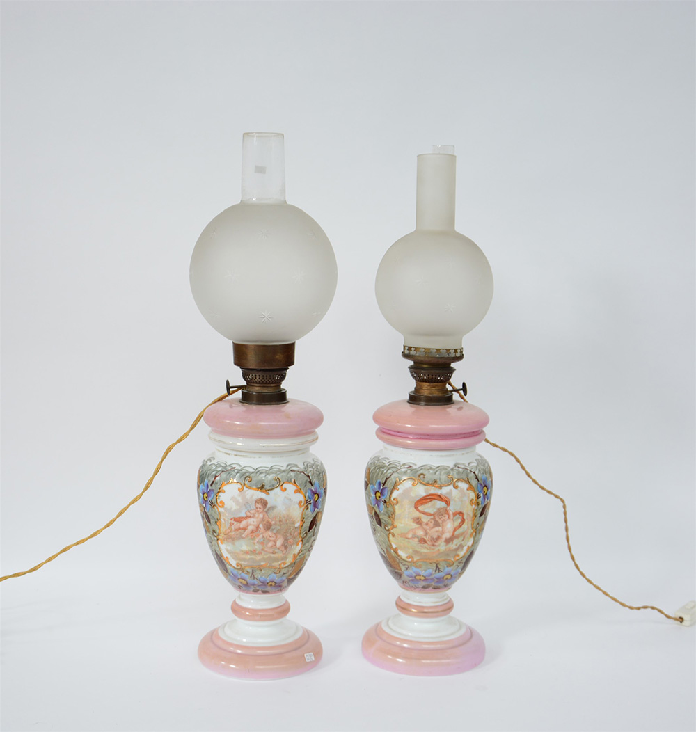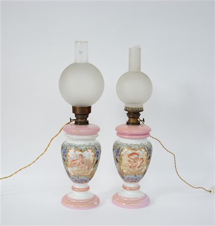 Coppia di lampade in opaline decorate in policromia con putti e fiori (h cm 67) fine sec. XIX (difetti)