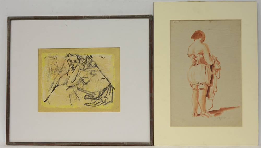 Gianni Vagnetti (Firenze 1897 - 1956) "Donna col bustino" (1930) "Studio per figura" due tecniche miste (misure diverse) Firmate in basso a destra e in alto a destra. Bibliografia: monografia di "Gianni Vagnetti" Luigi Cavallo 1975 TAV LXXXI fig 30, tav. CCLVII, fig. 53/11 (difetti) Una in cornice