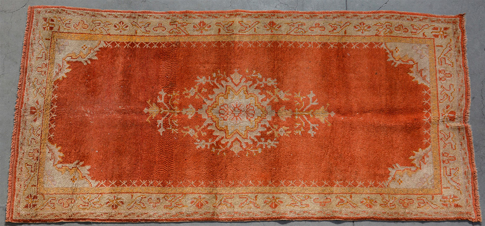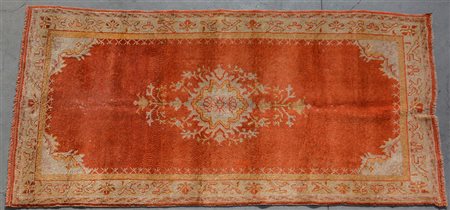 [Tappeti] Tappeto Ushak, Anatolia, inizio secolo XX. Disegno a medaglione bianco su fondo corallo (cm 189x93) (difetti)