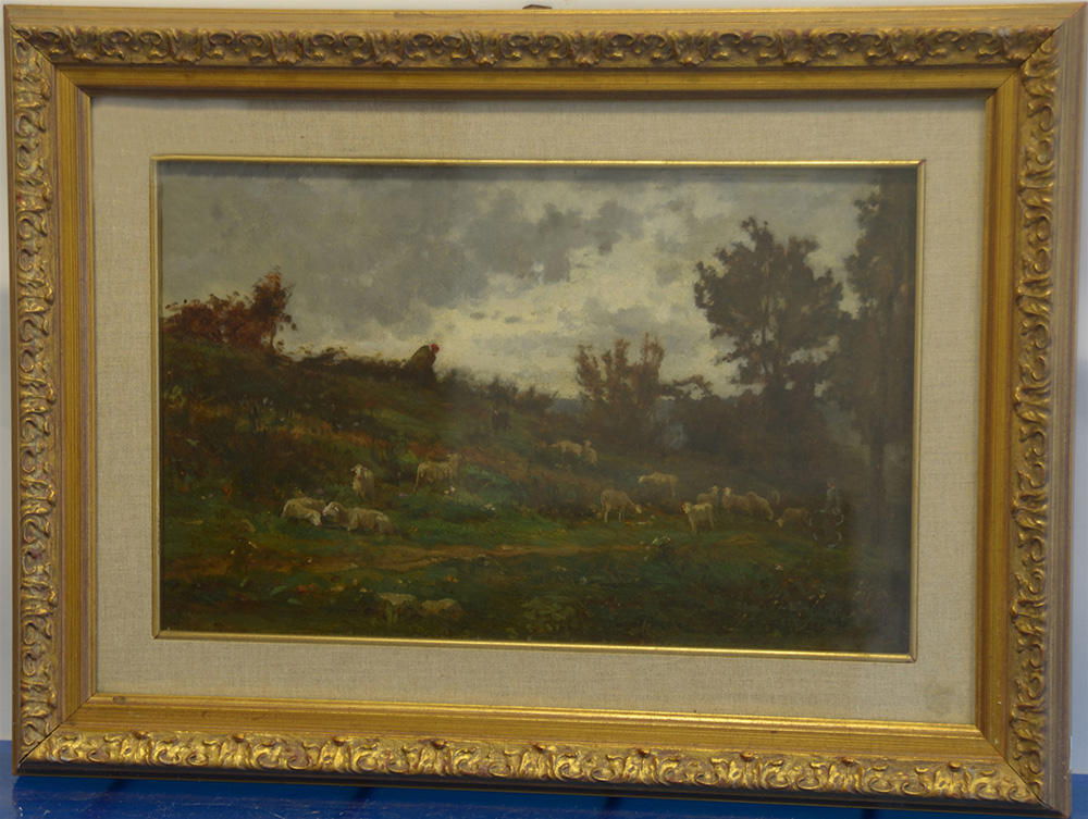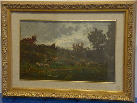 Scuola francese del secolo XIX "Paesaggio con armenti" olio su tavola (cm 25x38) in cornice (difetti)