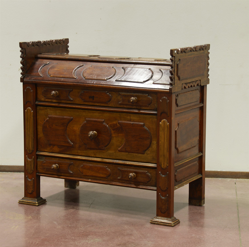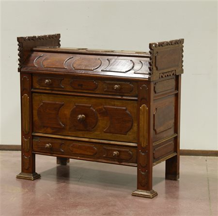 Antica madia in stile rinascimentale interamente pannellata, due antine ribaltabili e un cassetto alla base (cm 112x110x58) (difetti)