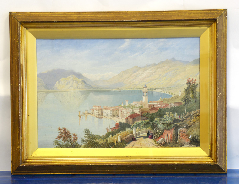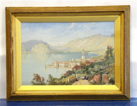 Scuola del secolo XIX "Scorcio del Lago di Como" olio su cartone (cm 35x52) in cornice (difetti)