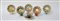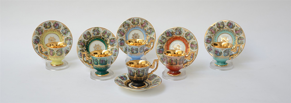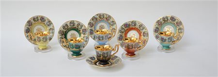 Manifattura tedesca. Servizio da caffè composto da sei tazzine con piattini, decorate a dorature e scene galanti. Ognuna di colore diverso