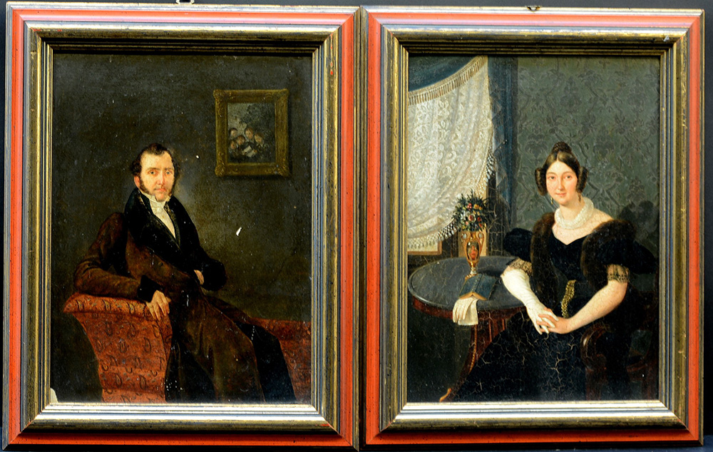 Ignoto "Gentildonna e Gentiluomo" Coppia di dipinti ad olio su tavoletta (cm 30x22) In corncice