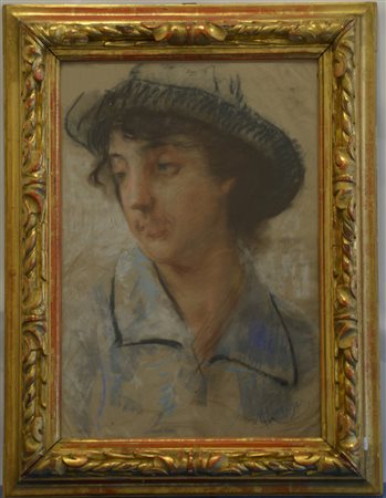 Mosè Bianchi (Monza 1840 - 1904) "Ritratto di giovane con cappello " pastelli colorati su carta (cm 52x35) firmato in basso a destra, in cornice (difetti) Al retro cartiglio della "Mostra commemorative di Mose Bianchi, Villa Reale di Monza, Maggio-Ottobre 1921