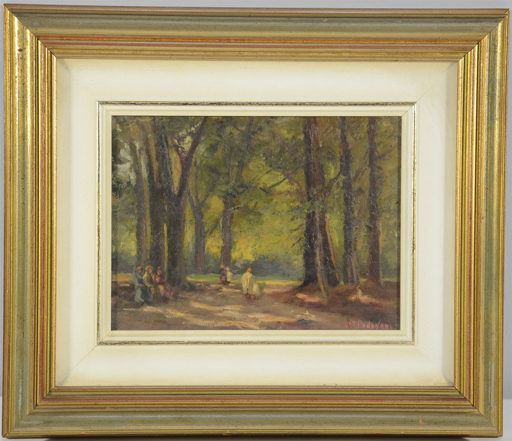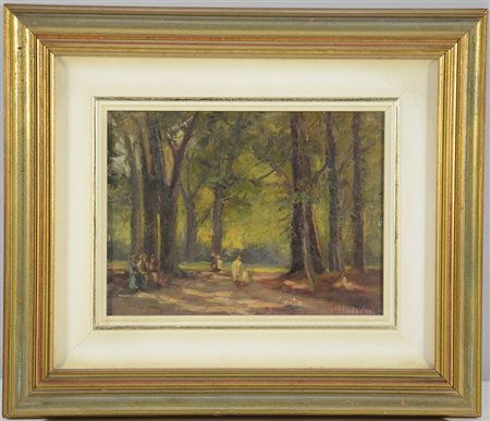 Padovani M. "Scorcio di parco con figure" olio su cartone (cm 18x23) firmato in basso a destra, in cornice