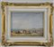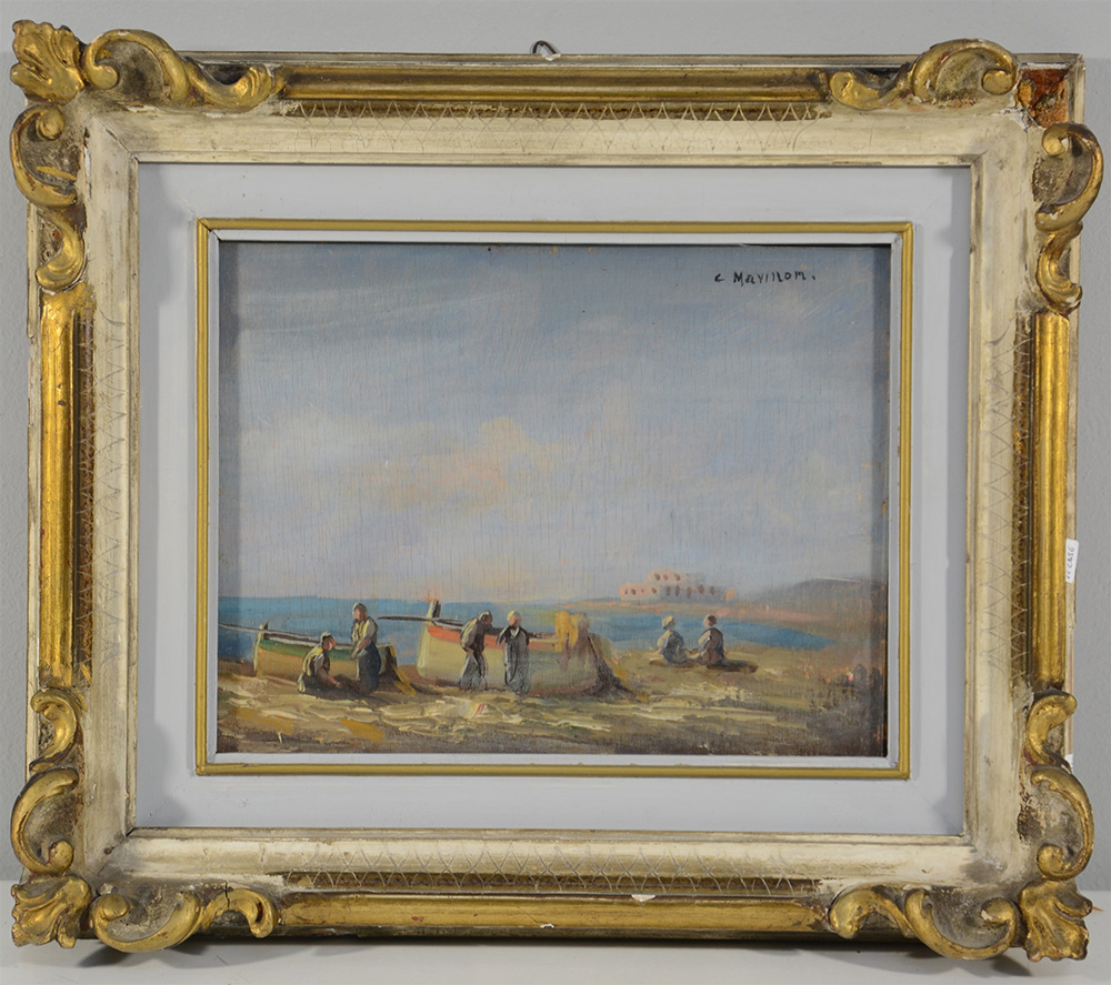 Firma indecifrata "Paesaggio marino con pescatori e barche" olio su compesnato (cm 20x25)firmato in alto a destra, in cornice (difetti)