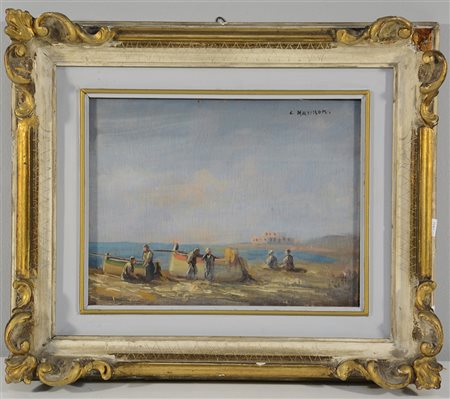 Firma indecifrata "Paesaggio marino con pescatori e barche" olio su...