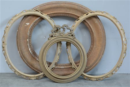 Lotto composto da quattro cornici ovali in legno e pastiglia di misure diverse (difetti)