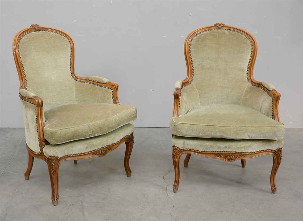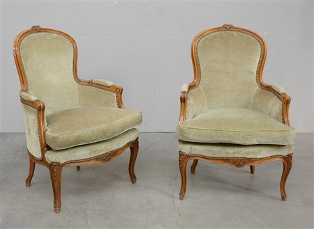 Coppia di poltrone con schienale, montanti e braccioli mossi e scanalati; gambe intagliate e sagomate
