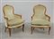 Coppia di poltrone con schienale, montanti e braccioli mossi e scanalati;...
