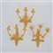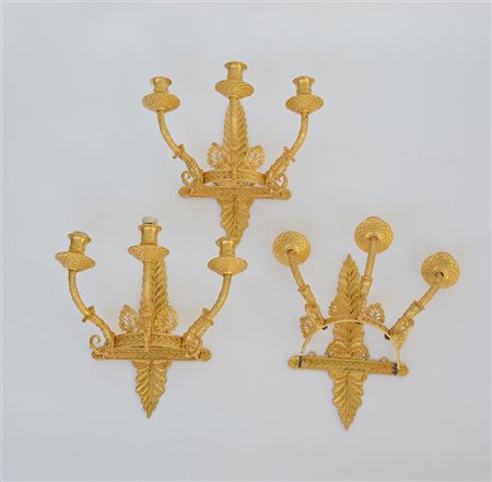 Gruppo di tre appliques in stile Impero a tre fiamme in bronzo dorato decorate da supporto e reggicandele di forma sagomata, motivi fogliati e rami fioriti (h. cm 26,5) (difetti)