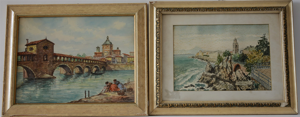 Lotto composto da due acquarelli raffiguranti paesaggi, di autori diversi. In cornici