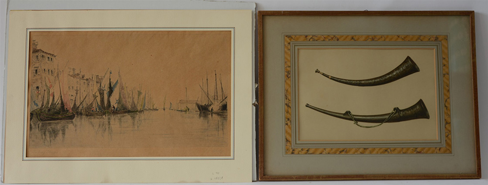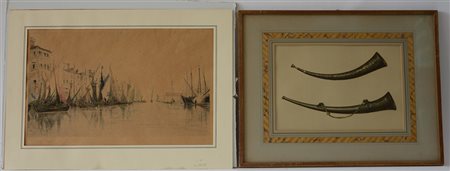 Lotto composto da una litografia raffigurante scorcio di Chioggia e una stampa raffigurante corni da caccia, una in cornice