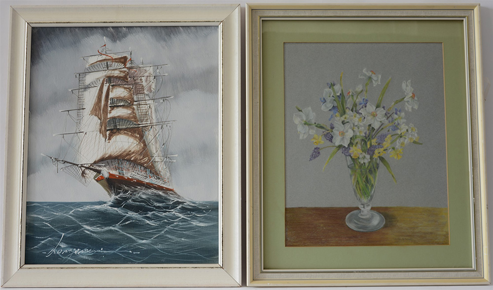 Lotto composto da un dipinto ad olio raffigurante veliero e un disegno raffigurante vaso con fiori, in cornici