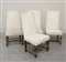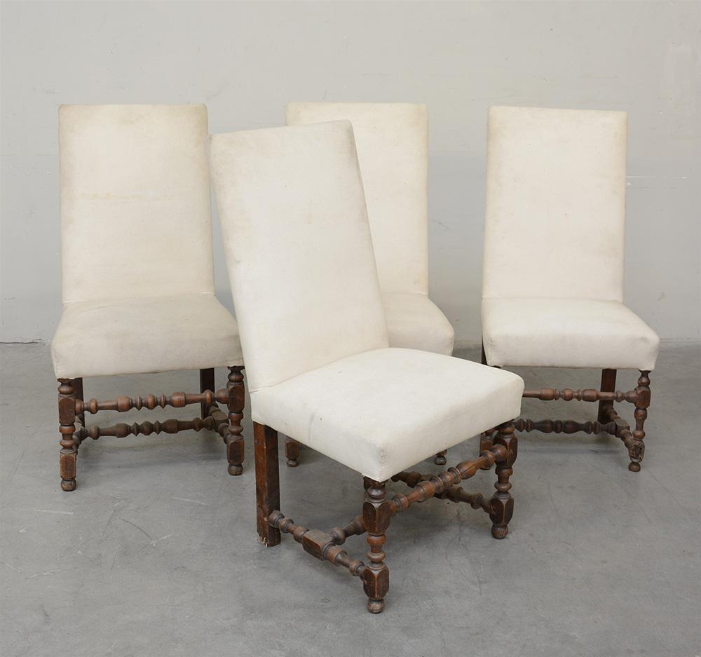 Gruppo di quattro sedie in noce con gambe tornite a rocchetto, rivestimento in tessuto bianco (difetti)