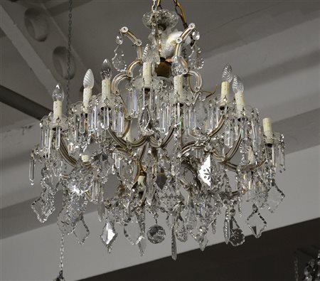 Lampadario a 16 luci in vetro con braccia sagomate e pendagli sfaccettati (difetti)