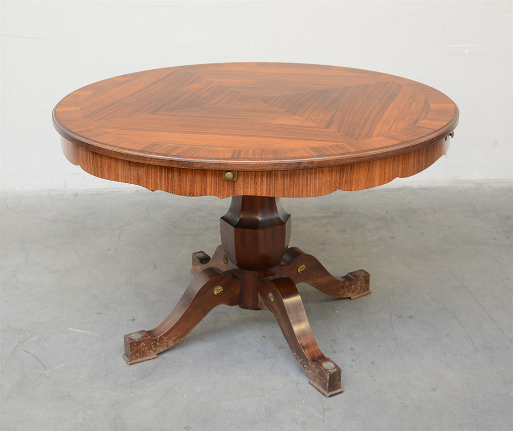 Tavolo allungabile tondo in palissandro con gamba centrale a balaustro decorato con applicazioni in metallo dorato (d cm 122 e h cm 78) (difetti)