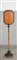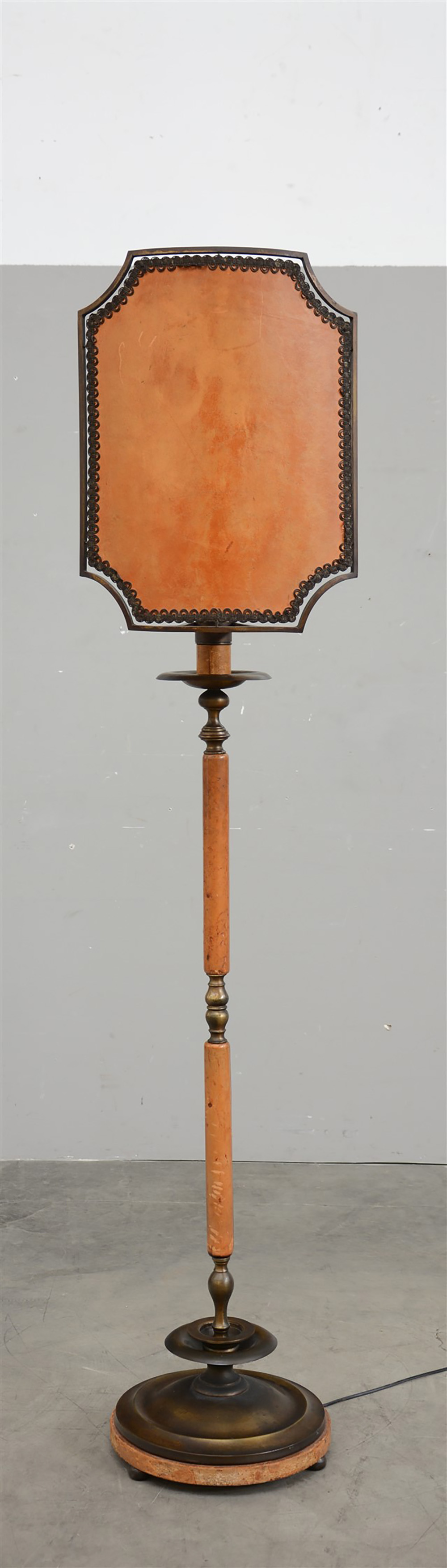 Lampada da terra in ottone e legno rivestito in cuoio con base tornita