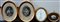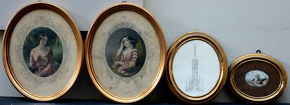 Gruppo di quattro cornici ovali dorate, contenenti stampe e miniature, misure diverse