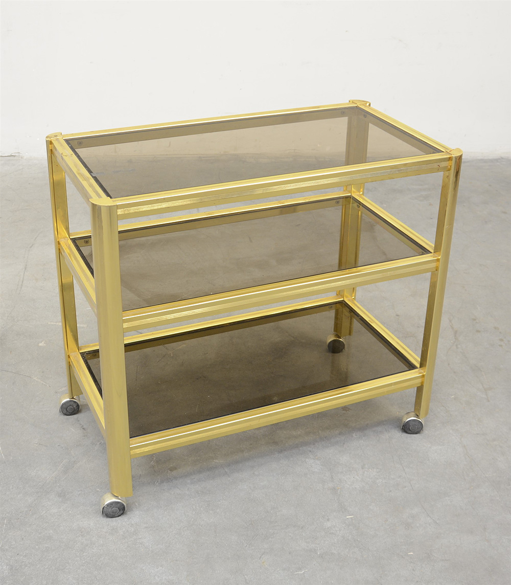 Carrello portavivande in ottone con tre ripiani in vetro fumè. Anni 70