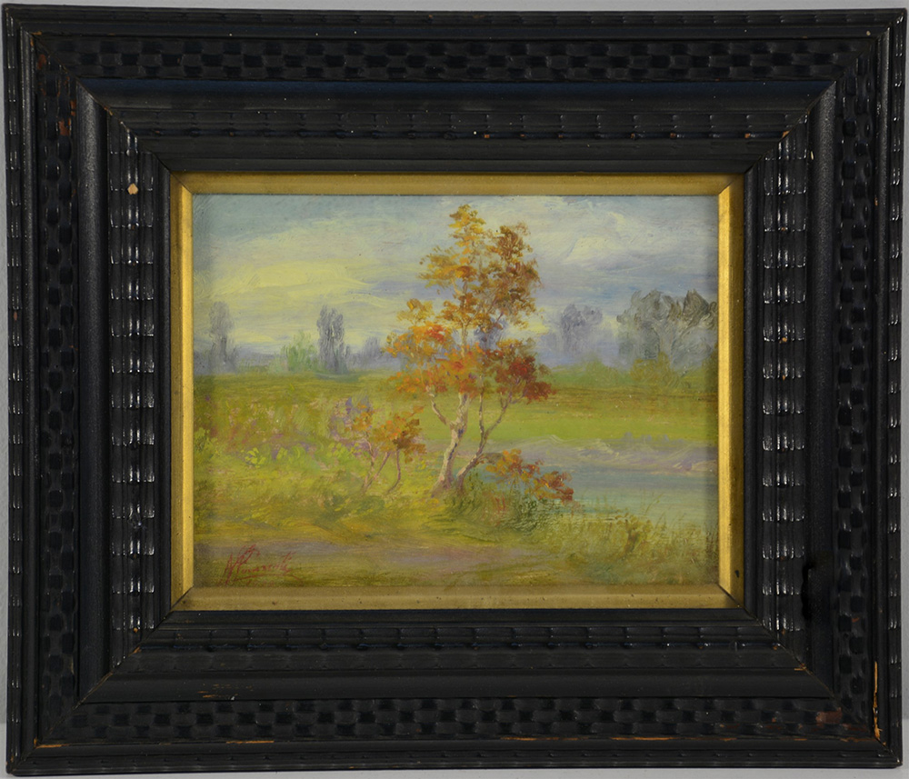 Laurenti "Scorcio di campagna" olio su cartone (cm 14x18) firmato in basso a sinistra, in cornice