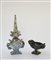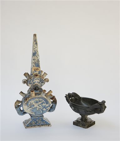 Lotto composto da una coppa in marmo biansata decorata con figure di animali fantastici e una tulipaniera in ceramica bianca e blu decorata a fiori (difetti)