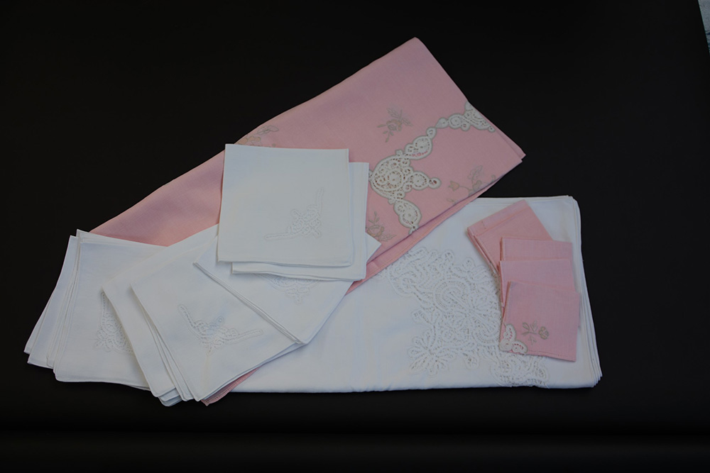 Tovaglia in cotone con inserti in pizzo di Cantù corredata con dodici tovaglioli con inserto di pizzo (cm 260x150) unito a tovaglia da té in lino rosa ricamata con decoro di fiori sparsi con filo di cotone ecrù ed inserti in pizzo di Cantù corredata con sei tovagliolini (125x140 cm)(difetti)