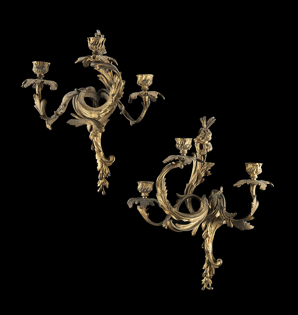 Coppia di appliques a tre fiamme in bronzo dorato decorato a rami fioriti (h....