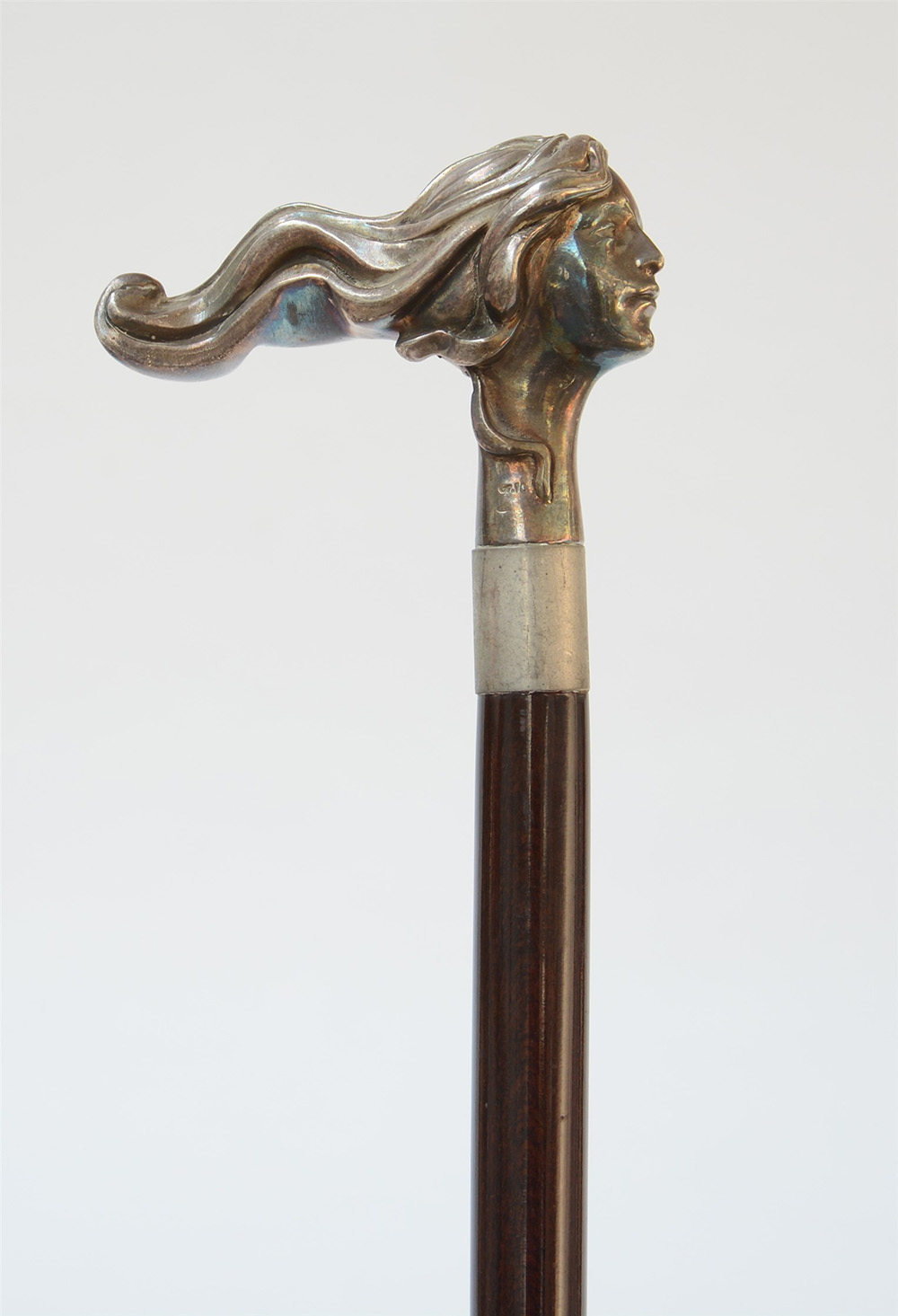 Bastone con impugnatura in metallo argentato con profilo femminile